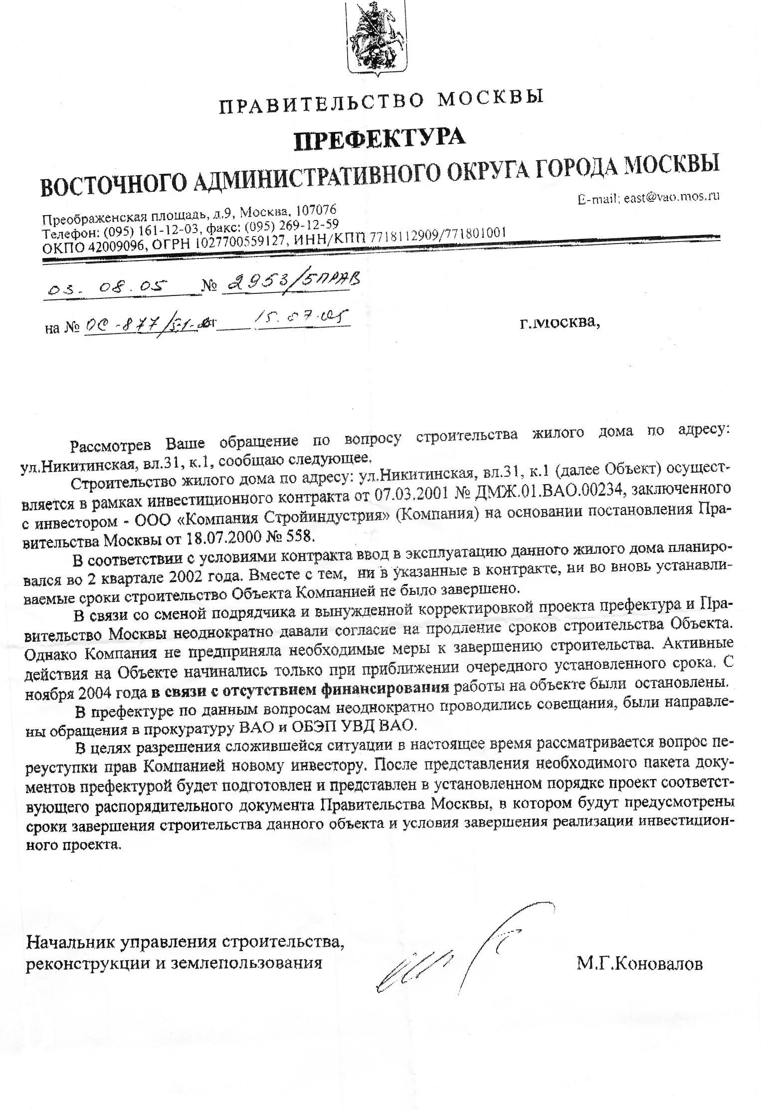 Ответ префектуры ВАО от 03.08.2005г. на официальный запрос ИГН
